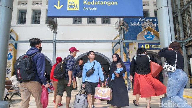 Jakarta - Arus balik Lebaran masih terjadi di Stasiun Pasar Senen, Jakata. Sejumlah penumpang memilih balik ke Jakarta pada H+7 perayaan Idul Fitri 1445 Hijriah. Salah satu alasannya karena baru mendapatkan tiket kereta api.