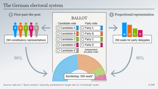 Sistem pemilu di Jerman adalah campuran dari sistem proporsional dan sistem pemilihan langsung. Artinya, setiap pemilih Jerman memiliki dua suara. Dengan suara pertama mereka memilih nama kandidat yang mereka inginkan sebagai wakil rakyat (pemilihan langsung), dengan suara kedua mereka memilih partai politik (pemilihan proporsional).