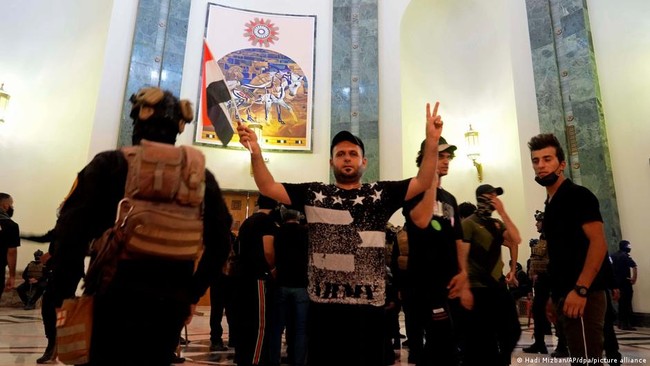 Para pengunjuk rasa menggunakan tali untuk merobohkan tembok penghalang yang melindungi istana pemerintah. Hal ini mendorong militer Irak menyerukan pengunjuk rasa untuk segera menarik diri dari Zona Hijau. Militer mendesak para pengunjuk rasa untuk berlatih menahan diri untuk mencegah bentrokan atau pertumpahan darah lebih lanjut di Irak, menurut sebuah pernyataan.