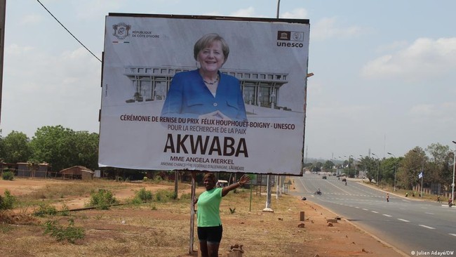 Tidak hanya di sisi bangunan, poster raksasa Angela Merkel juga tersebar di jalan-jalan Yamoussoukro. Merkel sukses menjadi perbincangan di kota itu.