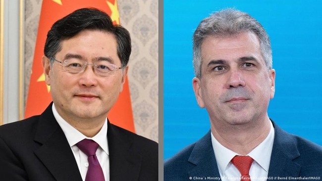 Qin mendorong Menteri Luar Negeri Israel Eli Cohen untuk melanjutkan pembicaraan damai dengan Palestina, dan lebih jauh mengatakan Cina "siap memberikan kemudahan untuk ini." Dalam percakapan terpisah dengan Menteri Luar Negeri Palestina Riyad Al-Maliki, Qin menegaskan kembali sikap Beijing.