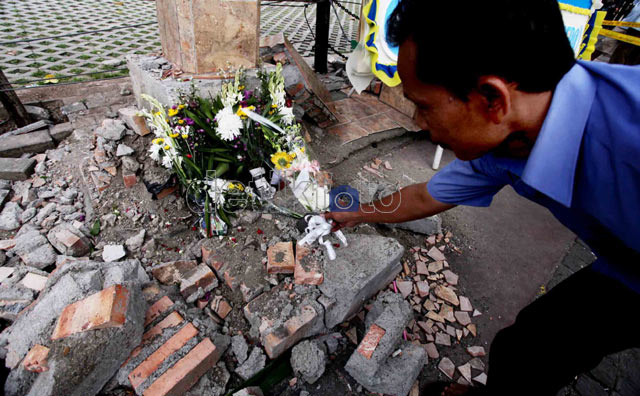 Jakarta - Warga yang bersimpati kepada korban kecelakaan Xenia maut memberikan karangan bunga di lokasi kejadian,Jl Ridwan Rais, Jakarta Pusat, Senin (23/1/2012). Mereka menghentikan kendaraan sebentar dan berdoa kepada korban meninggal karena kelalaian fatal pengemudi Xenia kemarin.