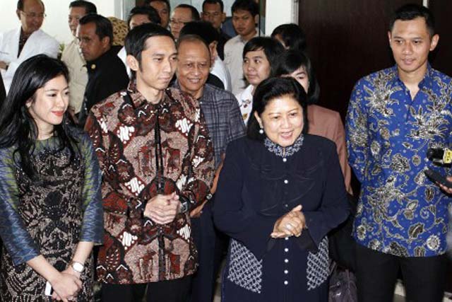 Jakarta - Ibu Negara Ny. Ani Yudhoyono didampingi anak dan menantu menyapa wartawan ketika meninggalkan RSPAD Gatot Soebroto, Jakarta, Minggu (18/3). Ibu Negara Ny. Ani Yudhoyono diperbolehkan tim dokter meninggalkan RSPAD setelah kondisinya dinyatakan sudah sehat pasca menjalani rawat inap untuk operasi pengangkatan kandung empedu beserta batunya sejak hari Kamis (15/3) lalu.