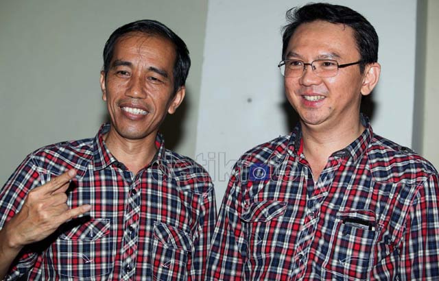 Jokowi memperlihatkan tangannya dengan gaya metal saat didampingi calon wakilnya Ahok (kanan), di Jakarta.