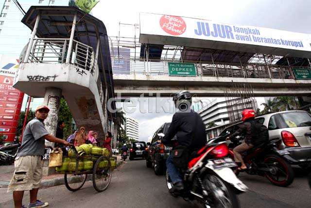 Jakarta - Atap jembatan halte Busway Depkes terlihat tidak terawat, Selasa (3/4/2012). Penutup atap jembatan yang jebol di halte tersebut tak kunjung diperbaiki.