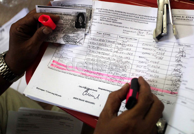 Satu persatu KTP dukungan pasangan bakal calon Gubernur DKI jalur independen diperiksa oleh petugas KPUD.