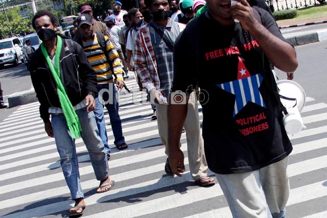 - Belasan pemuda Papua berunjuk rasa di Badan Pemeliharaan Keamanan Markas Besar Kepolisian Negara RI di Jakarta, Selasa (22/5/2012). Mereka menuntut Polri menghentikan kekerasan di tanah Papua yang terus menerus terjadi seperti pada 15 Mei lalu.