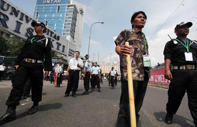 Puluhan orang mencoba bertahan dengan membawa pentungan di kampus Trisakti Grogol, Jakarta.