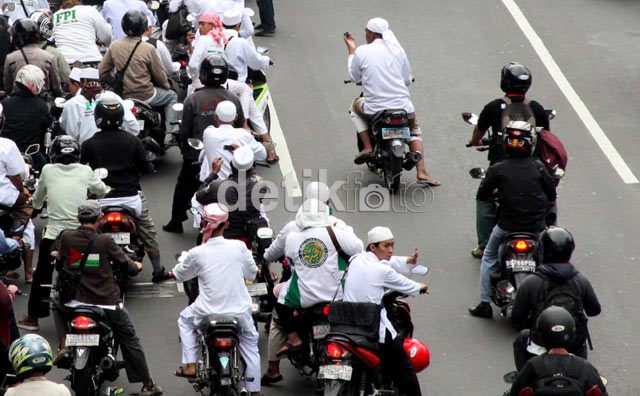 Jakarta - Massa FPI dan berbagai organisasi lain yang tergabung dalam Forum Umat Islam (FUI) melakukan pawai dari Bundaran HI menuju Istana Merdeka, Jumat (1/6/2012). Mereka mengkampanyekan gerakan anti maksiat seperti goyangan Trio Macan, kasus narkoba ataupun para artis yang dianggap seronok.