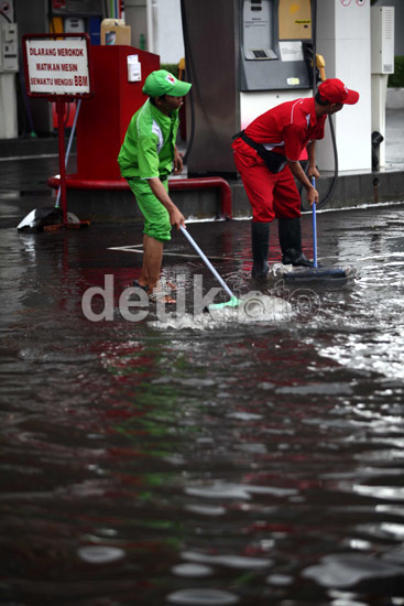 Jakarta - Hujan deras mengguyur kawasan Jakarta dan sekitarnya, Rabu (6/6/2012). Selain jalan raya, SPBU juga ikut tergenang air.