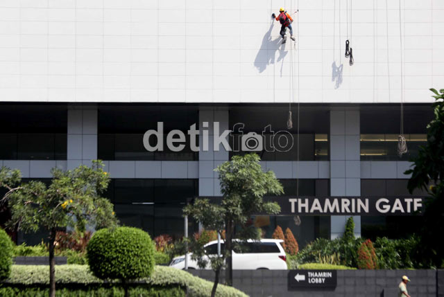 - Pekerja pembersih gedung bertingkat bergelayutan di salah satu gedung di kawasan Thammrin, Jakarta, Rabu (20/6/2012). Dengan alat khusus yang telah memenuhi syarat, mereka dengan sabar membersihkan dinding kaca maupun plat alumunium penutup gedung.