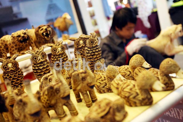 - Kerajinan ukiran kayu berbentuk miniatur binatang turut mejeng di salah satu stand di Hall B arena Pekan Raya Jakarta. Kerajinan karya anak Bandung, Jawa Barat itu sudah mendunia karena beberapa kali diekspor ke Amerika dan Eropa.
