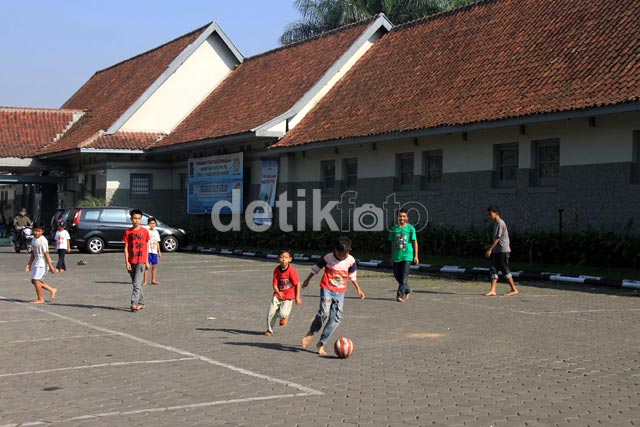 Jakarta - Anak-anak bermain sepakbola di halaman rumah tahanan klas 1A Kebon Waru, Kota Bandung, Minggu (22/7/2012). Minimnya tempat bermain bola membuat sejumlah anak memanfaatkan halaman parkir yang ada sebagai tempat bermain.