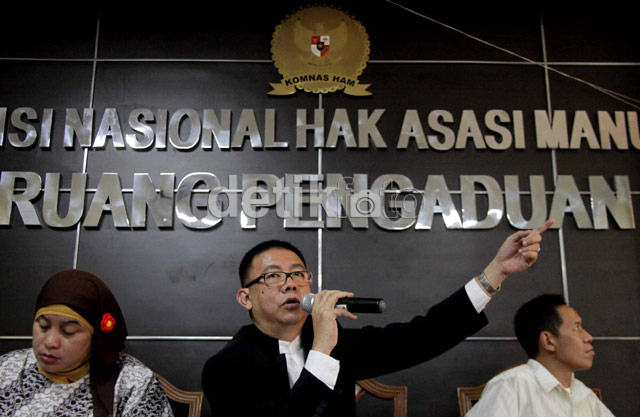 Anggota Komnas HAM Yoseph Adhi Prasetya memaparkan hasil penyelidikan kasus Petrus tahun 80-an di kantor Komnas HAM, Jakarta, Selasa (24/7/2012). Hasil itu berdasar keterangan saksi, bukti dan literatur. Komnas HAM menemukan bukti bahwa rezim waktu itu menyetujui pembunuhan orang-orang yang dituduh preman tanpa pengadilan.