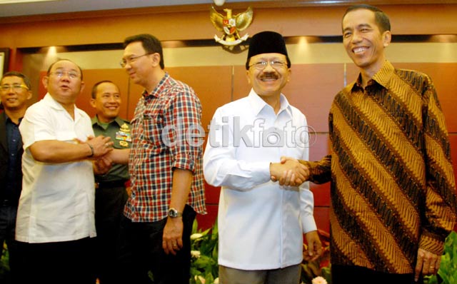 Jakarta - Pasangan cagub/cawagub Jokowi-Ahok bertemu dengan pesaingnya, Fauzi Bowo-Nachrowi Ramli di Mapolda Metro Jaya, Senin (10/9/2012). Keempatnya tampak tersenyum, saling berbincang dan berjabat tangan.