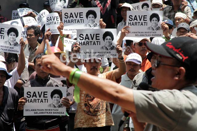 - Sekitar 100 orang dari pendukung Hartati Mudaya berunjukrasa di halaman Pengadilan Tipikor, Jakarta, Rabu (12/9). Mereka meminta Hartati tidak ditahan dan diproses hukum karena menilai Hartati berjasa dalam pengembangan investasi di Indonesia.