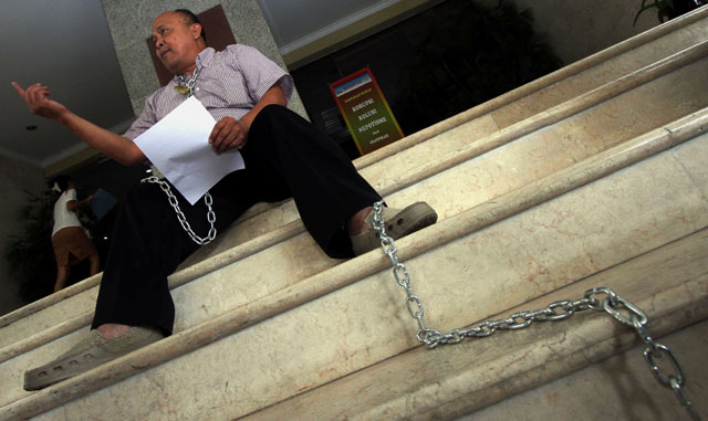 Aksi Pasung Diri di Bareskrim Polri BAGIKAN URL telah disalin Arifin Wardiyanto melakukan aksi pasung diri di depan gedung Bareskrim Polri. (Romy) Aksinya hanya dilakukan seorang diri. (Romy) Arifin Wardiyanto membacakan tuntutannya. (Romy) Sejumlah pengunjung dan polisi berusaha melepaskan rantai yang membelenggu Arifin. (Romy)