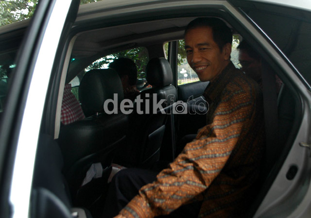 - Gubernur DKI Jakarta terpilih, Joko Widodo, menyambangi Gedung DPR untuk bertemu dengan anggota Fraksi PDI Perjuangan, Jumat (5/10/2012). Beda dengan kunjungan sebelumnya, Jokowi kini mengenakan baju batik, bukan kotak-kotak.