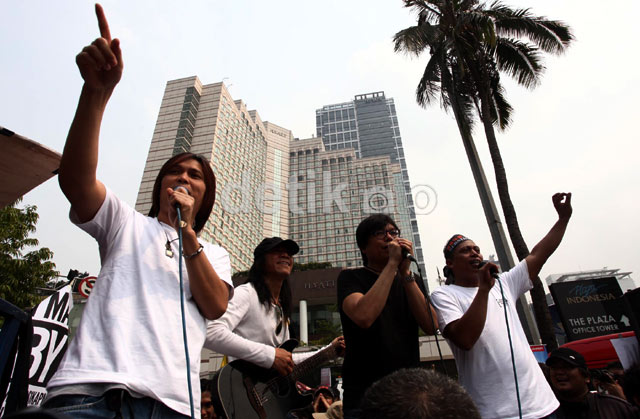 - Sejumlah musisi menghadiri aksi damai 'Save KPK' di Bundaran HI, Jakarta, Minggu (7/10/2012). Mereka bernyanyi di hadapan para pendukung KPK yang memadati bundaran HI.