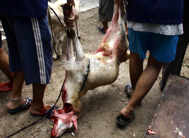 Ribuan Paket Kurban Siap Dibagikan BAGIKAN URL telah disalin Umat Islam merayakan Hari Raya Idul Adha atau Hari Raya Kurban 1433 Hijriah yang ditandai dengan pemotongan hewan kurban Sebanyak 20 ekor sapi dan 102 ekor kambing untuk kurban di Masjid Sunda Kelapa, Menteng Jakarta Pusat, Jumat (26/10/2012). (Ramses/detikcom) satu persatu hewan kurban tersebut dipotong. (Ramses/detikcom) Usai di potong daging-danging tersebut ditimbang. (Ramses/detikcom) Sejumlah warga bahu membahu menyiapkan paket hewan kurban. (Ramses/detikcom)