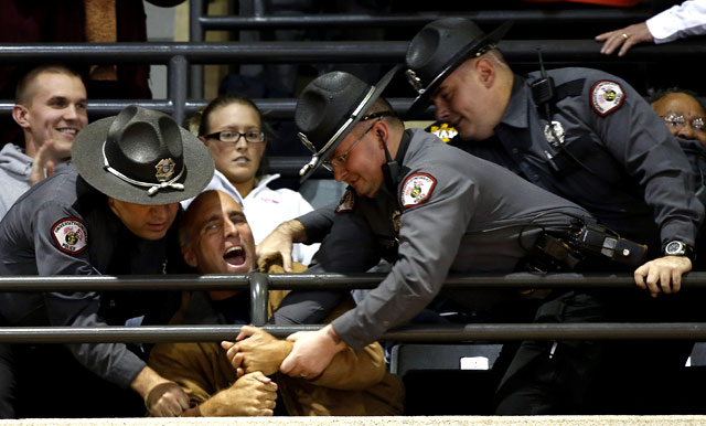 Tiga orang polisi berusaha mengeluarkan seorang demonstran yang melakukan protes dari aula Universitas Cincinnati. Reuters/Larry Downing.
