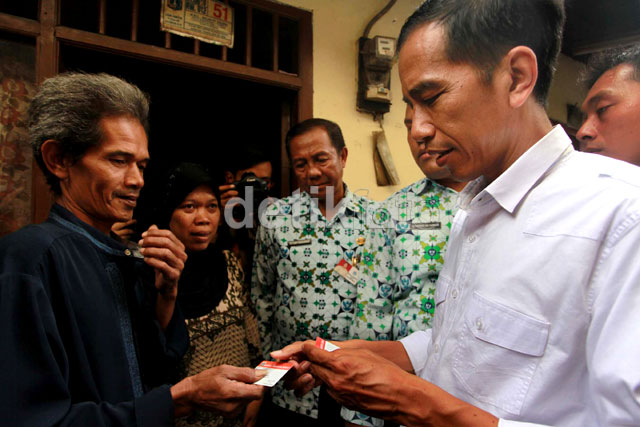- Gubernur DKI Jakarta Joko Widodo (Jokowi) membagikan Kartu Jakarta Sehat (KJS) di Kelurahan Bukit Duri, Tebet, Jakarta Selatan, Senin (12/11). Kartu Jakarta Sehat ini memiliki sasaran kepada 4,7 juta jiwa atau setara dengan 50 persen jumlah total warga Ibukota. Untuk masa uji coba ini Kartu Jakarta Sehat dibagikan sebanyak 3.000 kartu di enam kelurahan yang dinilai kumuh dan padat penduduk.