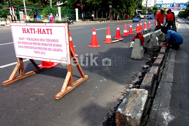 Sejumlah pekerja melakukan pekerjaan meninggikan separator Busway.