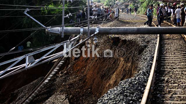 Jakarta - Akibat tanah longsor, rel KA sepanjang 50 meter amblas sedalam 20 meter, tanpa mengindahkan keselamatan puluhan warga menyemut di lokasi kejadian, Kamis (22/11).