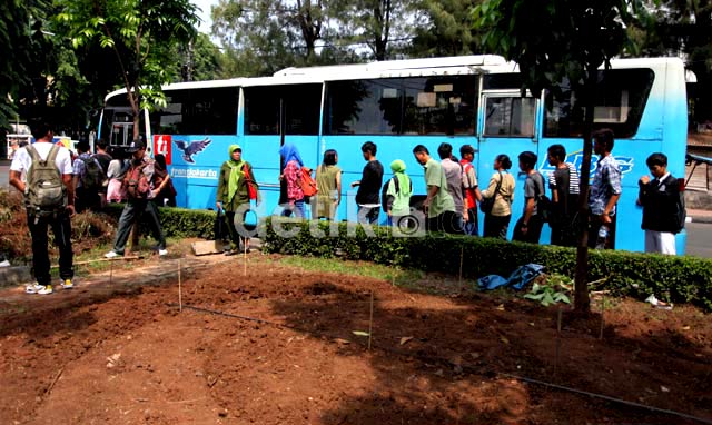 - Bus TransJakarta mogok di depan Stasiun Gambir, Jakarta, Senin (10/12/2012). Hal ini membuat penumpang turun dan menunggu perbaikan bus tersebut.