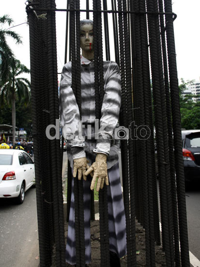 - Sebuah patung dengan baju tahanan dan tangan diborgol diletakan di tiang monorel yang berada di depan gedung KPK, Jalan Rasuna Said, Kuningan, Jakarta Selatan, Selasa (11/12/2012). Ditaruhnya patung berbaju tahanan dengan tangan diborgol itu untuk mendukung KPK agar berani menangkap para koruptor.