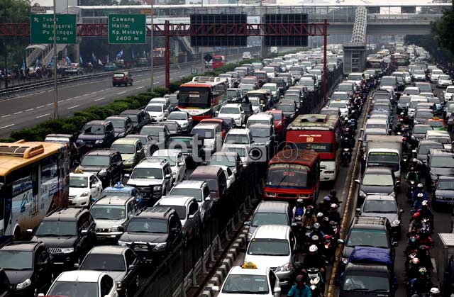 Jakarta - Ribuan perangkat desa menggelar aksi demo di depan gedung DPR, Jakarta, Jumat (14/12/2012). Akibatnya, arus lalu lintas di ruas tol dalam kota yang mengarah ke Grogol macet panjang.
