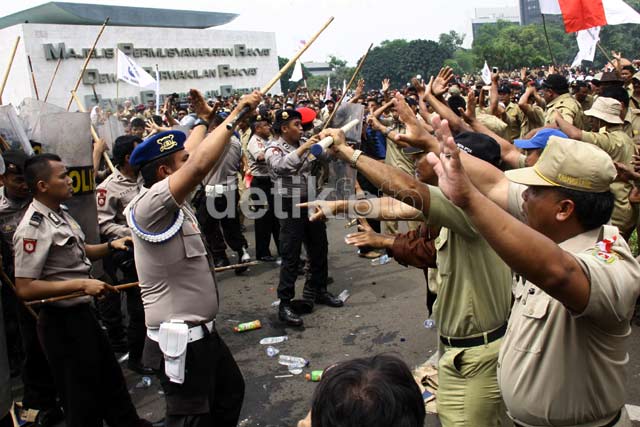Jakarta - Ribuan perangkat desa yang menuntut diangkat menjadi PNS sempat bentrok dengan polisi yang berjaga di depan gedung DPR, Jakarta, Jumat (14/12/2012). Bentrokan tersebut terjadi saat mobil demonstran hendak menerobos barikade polisi.