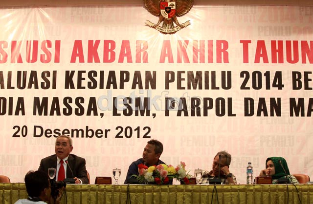 - Para narasumber memaparkan pandanganya soal evaluasi persiapan Pemilu 2014 di Gedung KPU, Jakarta, Kamis (20/12/2012). Mereka yakni Bupati Kutai Timur Isran Noor, Anggota KPU Arief Budiman, Anggota DPR Arif Wibowo dan Ketua Badan Pemenangan Pemilu PPP Fernita Darwis.
