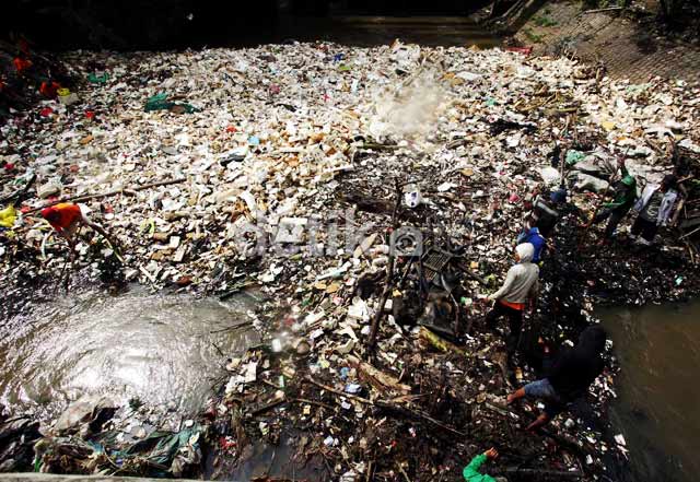 Tumpukan sampah rumah tangga menyumbat pintu air Kalimalang, Jakarta Timur, Rabu (26/12). Tumpukan sampah ini, akibat ulah manusia yang berlebihan dalam mengeksploitasi lingkungan.