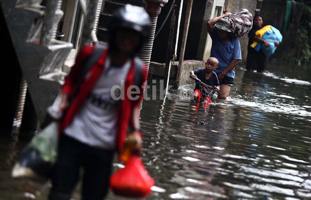 - Hujan yang berlangsung sejak kemarin malam hingga pagi tadi menyisahkan genangan air di pemukiman warga di kawasan cawang pulo, Jakarta Timur (15/1/2013).