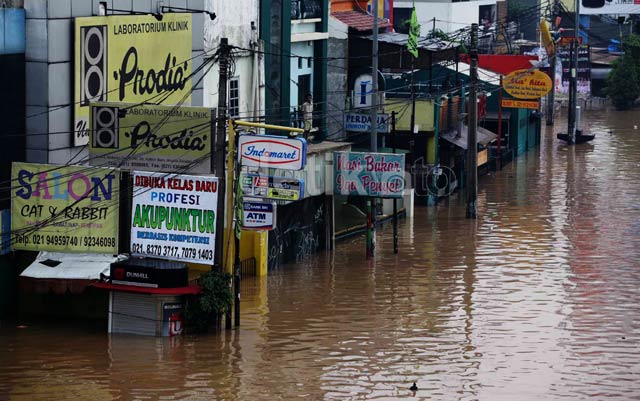 Banjir, Roda Ekonomi Terganggu BAGIKAN URL telah disalin Sejumlah toko tutup akibat banjir. Banjir membuat roda ekonomi terganggu. Karyawan 7 Eleven memilih berjaga di depan toko mereka. Banjir dengan ketinggian bervariasi melendan sejumlah wilayah di Jakarta. Banjir ini disebabkan meluapnya Sungai Ciliwung.