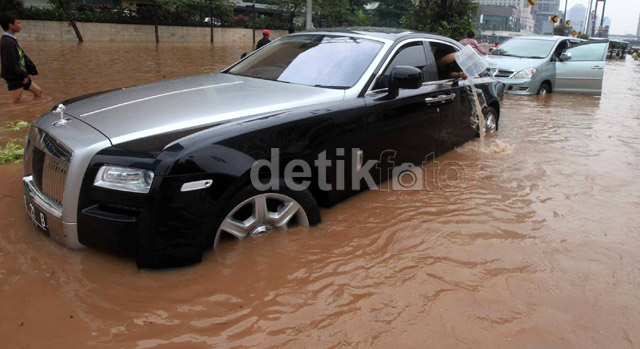 Jakarta - Sebuah mobil super mewah Rolls-Royce ikut menjadi korban banjir. Mobil mewah tersebut terjebak banjir di Bundaran HI, Jakarta, Kamis (17/13).