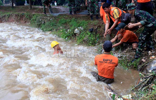 - Tanggul yang jebol di aliran air Banjir Kanal Barat, Jl Latuharhari, tepatnya di samping Taman Lawang, Jakarta, mulai ditambal, Kamis (17/1/2013). Tanggul tersebut ditambal dengan batu bronjong.