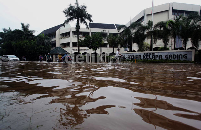 Banjir, Sekolah Al-Azhar Kelapa Gading Diliburkan BAGIKAN URL telah disalin Genangan air di depan sekolah tersebut cukup tinggi. Banjir juga memasuki area sekolah. Sekolah pun diliburkan. Warga menumpang truk untuk menyeberangi banjir. Pengendara melintasi banjir di sekolah Internasional Islam Al-Azhar Kelapa Gading. Sebuah sepeda motor mogok setelah nekat menerobos banjir.