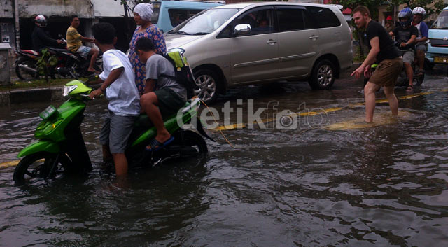 Jakarta - Mungkin warga Selandia Baru ini layak masuk acara bule gila di televisi. Daniel (30), saat banjir melanda Jakarta, malah asyik bermain selancar di depan Museum Bank Mandiri di Glodok, Jakarta, Jumat (18/1/2013).