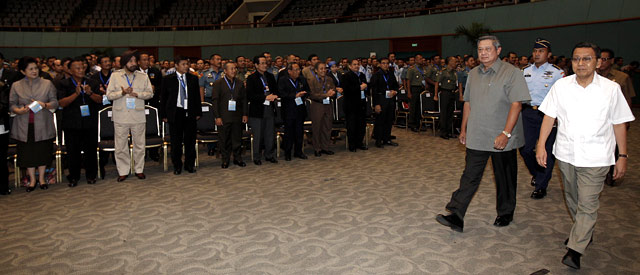 - Presiden Susilo Bambang Yudhoyono (SBY) bersama Wapres Boediono memimpin Rapat Kerja Pemerintah yang diselenggarakan di Plenary Hall, Jakarta Convention Center, Jakarta, Senin (28/1/2013). Rapat kerja ini dihadiri oleh kepala daerah, kapolda, dan pangdam dari seluruh Indonesia.