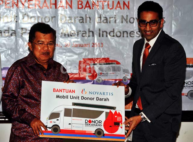- Novartis menyerahkan satu mobil unit donor darah kepada Palang Merah Indonesia (PMI) di Markas Pusat PMI, Jalan Gatot Soebroto, Jakarta, Rabu (30/1/2013). Mobil tersebut akan diberikan ke PMI Bandung guna mendukung pelayanan donor darah keliling.