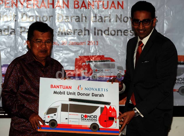 - Novartis menyerahkan satu mobil unit donor darah kepada Palang Merah Indonesia (PMI) di Markas Pusat PMI, Jalan Gatot Soebroto, Jakarta, Rabu (30/1/2013). Mobil unit donor darah tersebut akan diberikan ke PMI Bandung karena guna mendukung pelayanan donor darah keliling.
