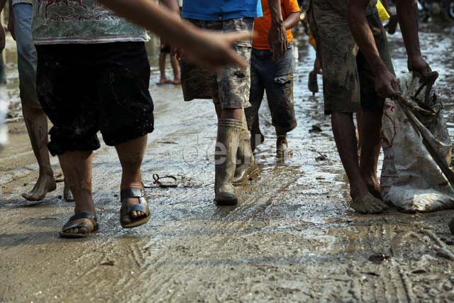 Warga Bersihkan Lumpur Sisa Banjir BAGIKAN URL telah disalin Warga bergotong royong membersihkan lumpur yang menumpuk di jalan. Mereka mengeruk lumpur yang cukup tebal dengan pacul. Dengan alat seadanya mereka membersihkan lumpur yang bisa membahayakan para pengendara tersebut. Seperti yang terlihat di blok terdepan persis di depan gapura selamat datang di Perumahan Pondok Gede Permai. Anggota TNI membersihkan lumpur sisa banjir.
