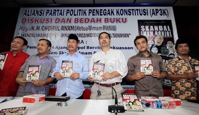 - Para pimpinan partai politik yang tidak lolos ke Pemilu 2014 menghadiri peluncuran buku 'Skandal Imam Bonjol' di Jakarta, Jumat (15/2/2013). Buku yang ditulis oleh Ketua Umum Partai PKNU Choirul Anam tersebut banyak mengkritik soal keputusan KPU yng hanya meloloskan 10 parpol dalam Pemilu tahun depan.