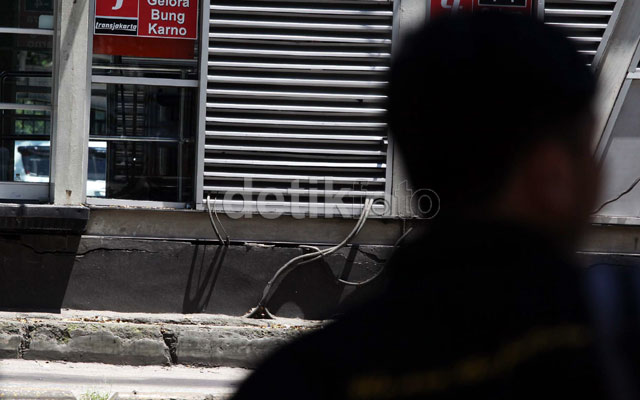 - Pondasi halte Busway Gelora Bung Karno, Senayan, Jakarta, Senin (11/3), terlihat retak-retak. Sampai saat ini belum ada perbaikandari pihak yang bersangkutan.