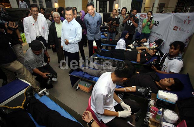 - Ketua Umum PMI, Jusuf Kalla menghadiri pekan donor darah 'Menatap Masa Depan' di Epicentrum Walk, Kuningan, Jakarta, Selasa (19/3/2013). Acara tersebut digelar dalam rangka Ultah Grup Bakrie.