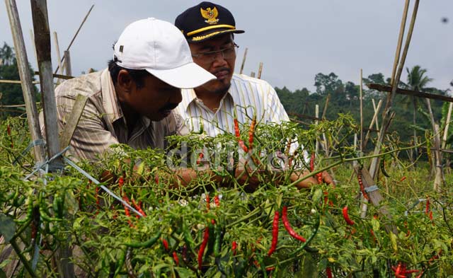 - Mentan Suswono kemarin mengunjungi sentra produksi cabai siap panen seluas 3 ha di wilayah Caringin, Bogor. Di sini harga cabai merah kriting Rp 15.000 per kg.