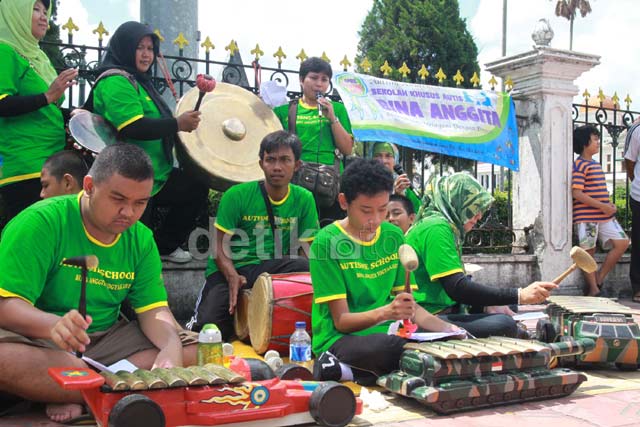 - Sekolah khusus autis Bina Anggita di Yogyakarta memperingati hari Autis Sedunia, Selasa (2/4/2013). Mereka menggelar permainan musik tradisional di depan Plaza Monumen SO 1 maret 1949 atau di titik nol kilometer Yogyakarta.