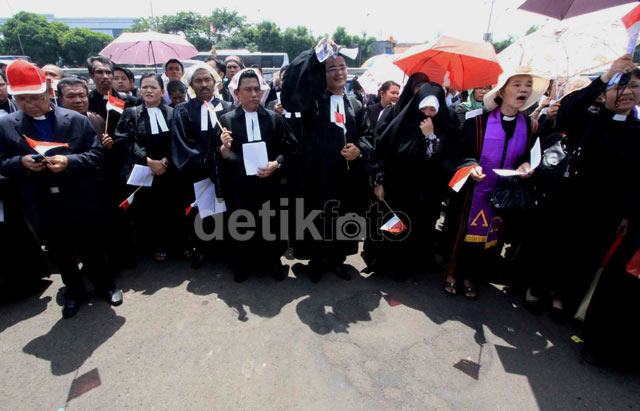 - Para rohaniwan berunjukrasa di gedung MPR, Jakarta, Senin (8/4/2013). Mereka meminta kebijaksanaan MPR mengenai masalah penutupan rumah ibadah secara sepihak, yang belakangan masih terus berlangsung.